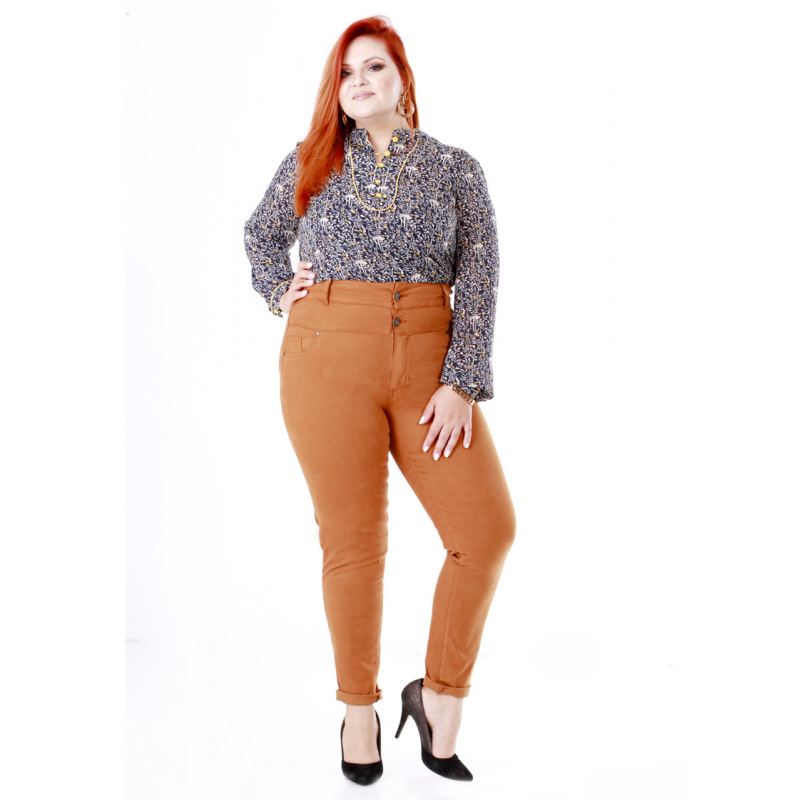 Pantalon slim taille haute avec découpe au devant orné de boutons métalliques apparents